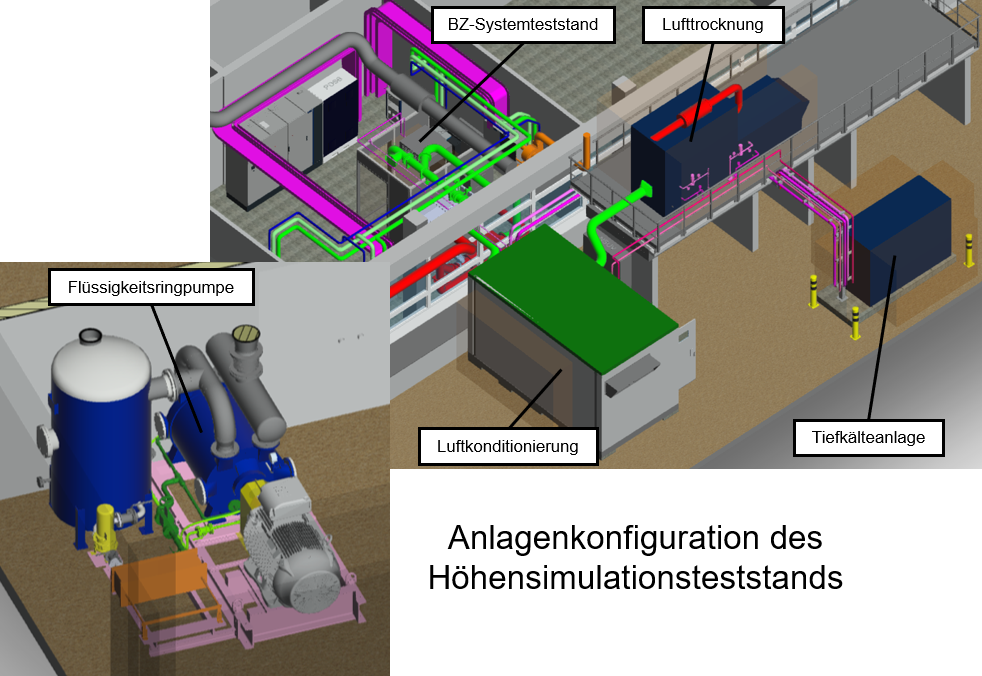 Mit der Höhensimulationsumgebung können Brennstoffzellensysteme mit bis zu 275 kW Leistung unter luftfahrtrelevanten Bedingungen (niedriger Druck und niedrige Temperatur) getestet werden. Dazu werden zum Einen die Zuluft sowie das Brennstoffzellenabgas mittels einer Vakuumpumpe abgesaugt. Zum Anderen wird die Zuluft durch ein ausgeklügeltes Luftkonditionierungssystem gleichzeitig entfeuchtet und auf bis zu –40 °C abgekühlt. Die dadurch generierten Luftbedingungen entsprechen jenen wie sie auf einer Höhe von 27.000 ft (8.230 m) vorherrschen. Damit wird es möglich, maßgeschneiderte Betriebsstrategien für brennstoffzellenbasierte Flugzeugantriebssysteme zu entwickeln und stetig zu verbessern.