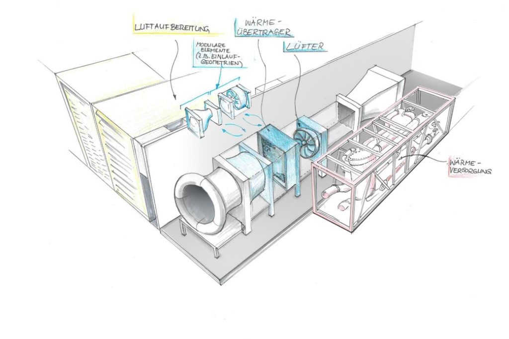 Der Prüfstand dient zur Erprobung verschiedener Konzepte zur Kühlung eines elektrifizierten Antriebsstrangs. Hierbei wird eine breite Variabilität der Einlassgeometrie (von Scoop bis hin zu Ring-Inlets) sowie des Auslasses, der internen Strömungsführung, der verwendeten Wärmetauscher, der (Hochleistungs)-Lüfter sowie anderer Komponenten ermöglicht. Der Prüfstand soll aus mehreren Segmenten bestehen, die austauschbar anzuordnen sind. Er verfügt über eine Wärmeversorgung zur Simulation eines Brennstoffzellenstacks mit einer Leistung von 1 MW. Die Querschnittsfläche für den Wärmetauscher ist variabel zwischen 0,5 m2 und 2 m2. Die zu testenden Hochleistungslüfter haben einen Durchmesser zwischen 400 mm und 1.000 mm.